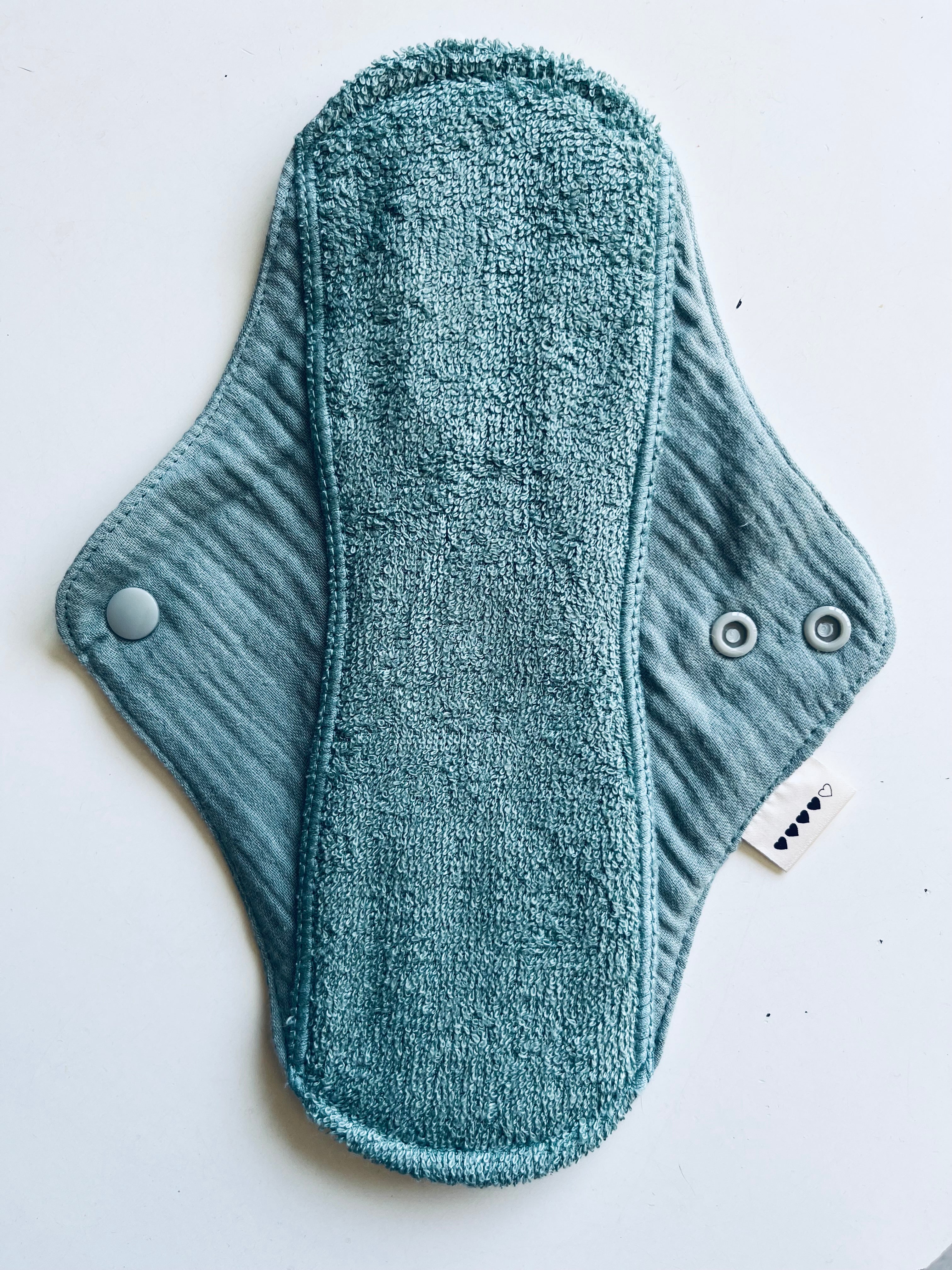 Un assorbente più grande, utile all'inizio del ciclo mestruale, quando le mestruazioni sono spesso più abbondanti. (2 strati di cotone, 2 strati di bambù, 1 strato di PUL impermeabile)